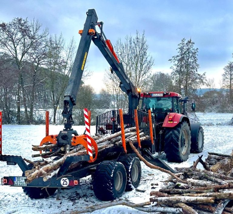 Unsere Antwort auf einen effektiven Holztransport ist der 12t Rückewagen von Reil und Eichinger. Der Rückewagen ist der ideale Kompromiss aus Geländegängigkeit und Geschwindigkeit im bei längeren Transporten. So ist es mit ihm möglich, Holz direkt aus dem Bestand an den Abfuhrplatz zu liefern, oder Polterholz vom Wald bis direkt zum Kunde zu befördern. Der Wagen punktet dank seiner Knick-deichsel durch seine hohe Wendigkeit, was ein bestandsschonendes Arbeiten oder Ausliefern auch in enge Einfahrten ermöglicht. Die hohe Kranreichweite von 8,1m ermöglicht zügige Be- und Entladevorgänge, sollte die Reichweite des Kranes nicht mehr ausreichen, bietet die angebaute Kranwinde eine perfekte Ergänzung. Je nach Holzart und -zustand können so bis zu zehn Festmeter, oder, nach ein paar Umbauarbeiten, bis zu sechs Holzbündel transportiert werden.