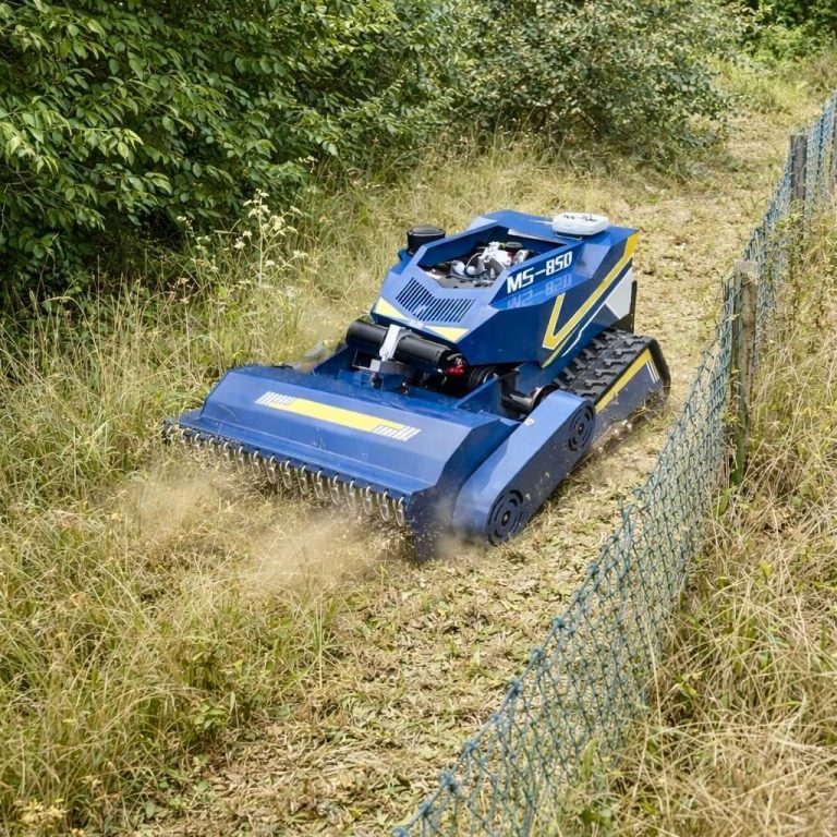 Unser Spezialist im extremen Gelände fängt da an, wo andere Maschinen die weiße Flagge schwenken. Durch ihr Raupenfahrwerk und niedrigen Schwerpunkt, kann sie nahezu jede Steigung bezwingen, ihr Mulchwerk mit Y-Schlägeln macht auf 85cm Arbeitsbreite mit Bewuchs kurzen Prozess. Dabei wird die Raupe mit einer Fernbedienung gesteuert, so dass der Bediener immer den nötigen Abstand waren und von einer sicheren Position aus arbeiten kann.